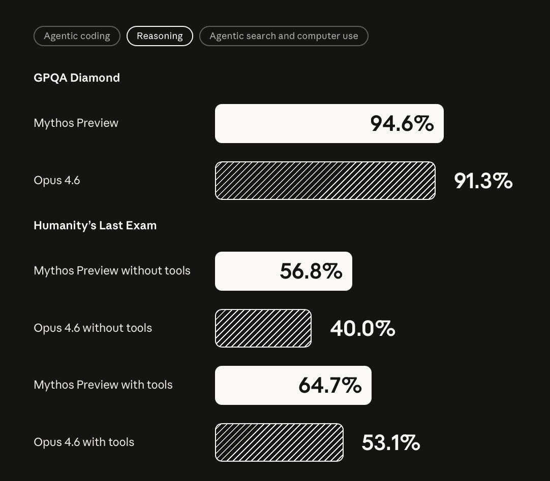 По бенчмаркам Mythos Preview действительно сильно опережает Claude Opus 4.6, но в исходном пересказе цифры были неточными. В официальном анонсе указаны такие результаты: CyberGym — 83,1% против 66,6%, SWE-bench Pro — 77,8% против 53,4%, Terminal-Bench 2.0 — 82,0% против 65,4%. То есть разрыв большой, но не такой, как в присланном тексте.